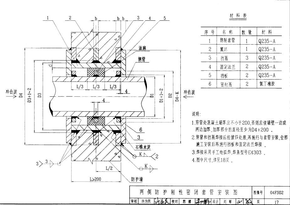 穿線(xiàn)密閉套管說明:1、當迎水麵為腐蝕性介質時,可采用封堵材料(liào)將縫隙封堵;2.套管穿牆處如遇(yù)非混凝土牆壁時,應局部(bù)改用混凝土牆壁,其澆注範圍應比翼環直徑(DS)大200,並且必須將套管一次澆固(gù)…